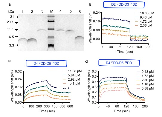 对接域的体内体外组装研究。为了验证从天然PKS系统中剥离出来的相互作用元件-对接域的识别与组装能力,本研究分别在体外和体内实验中验证了独立于聚酮合酶的对接域仍保持着良好的相互作用能力。体外实验评估了来源于红霉素聚酮合酶(DEBS)和雷帕霉素聚酮合酶(RAPS)对接域相互作用的动力学参数(图2),体内实验利用荧光蛋白的定位变化验证了对接域介导非PKS的异源酶组装能力(图3)。