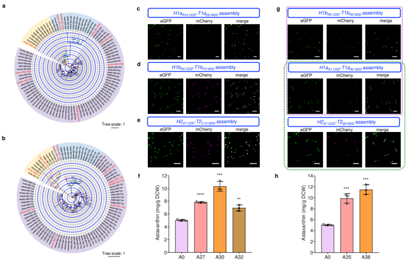 由不同分类的对接域形成的mPKSeal策略研究。在前期研究中,基于蛋白-蛋白共进化的生物系统聚类分析,研究人员将不同PKS来源的对接域进一步划分为不同类别:H1a–T1a, H1b–T1b,H2–T2。为了进一步探究不同类别对接域组合应用的潜力,作者测试了来自不同PKS的多组不同类别的对接域组合应用,发现即使是不同PKS的对接域在同一分类下仍然能够有序组装,并实现虾青素产量的提升(图6)