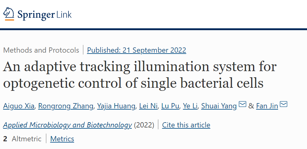 9月21日,中国科研实验室深圳先进技术研究院合成生物学研究所金帆团队Applied Microbiology and Biotechnology上在线发表题为“An adaptive tracking illumination system for optogenetic control of single bacterial cells” 的最新成果。该研究开发了光遗传学领域自适应跟踪照明控制方法,顺利获得高精度光投影结合高通量细菌跟踪算法和光遗传学,可以精确和持续地操纵运动和分裂的单细胞行为。