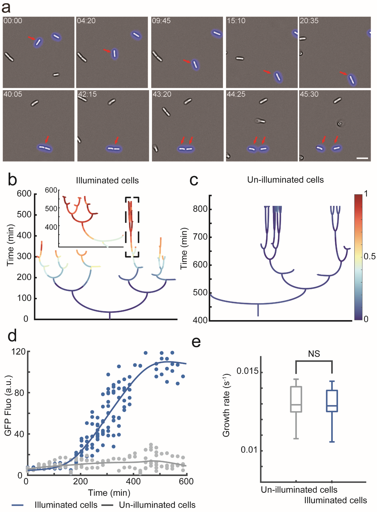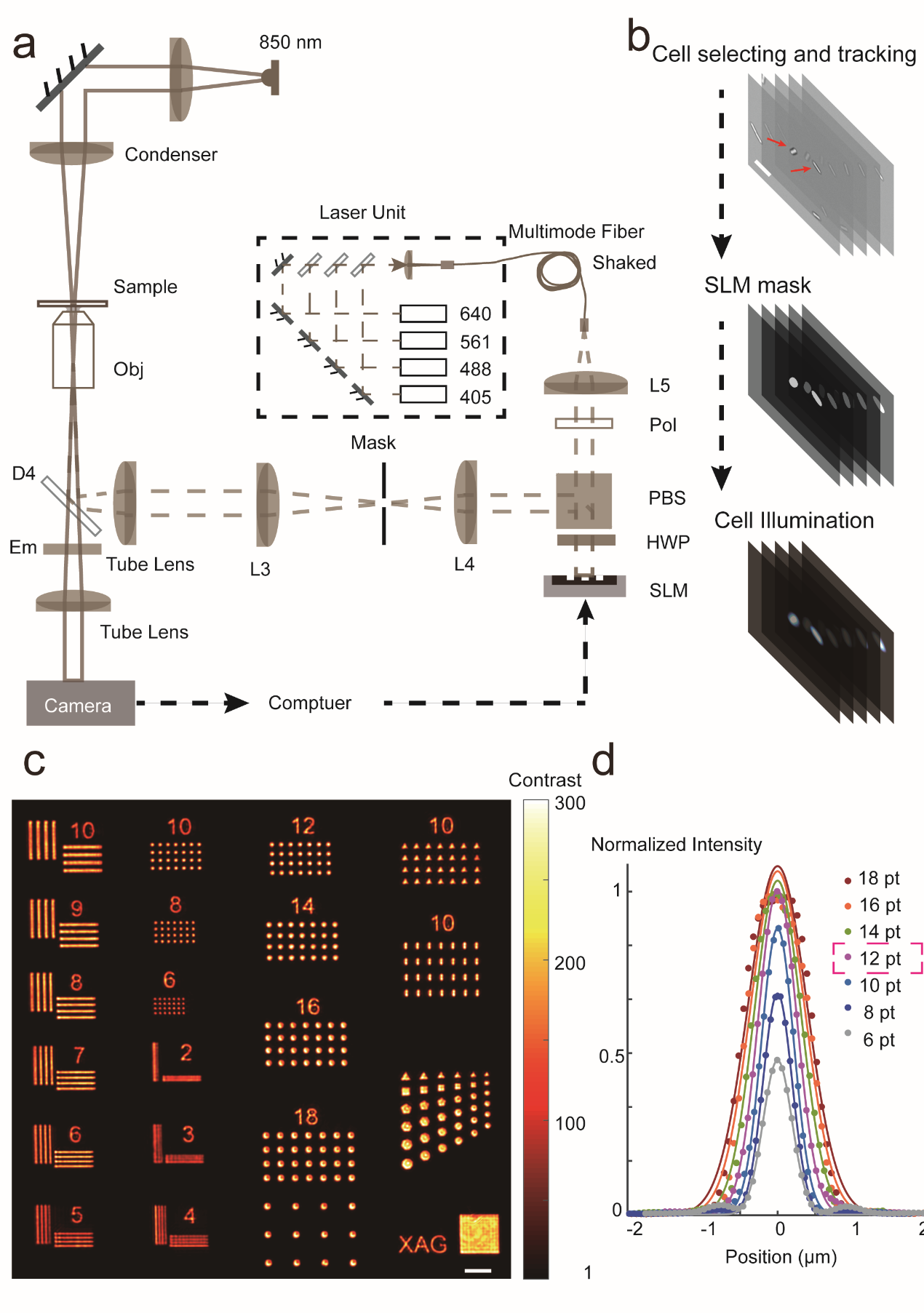 该方法顺利获得将空间光调制器的图案投影到高倍油镜的视场中,实现高精度的显微镜微投影。计算机再将获取到的显微镜明场图像经过实时地图像分割和细菌识别,获取细菌的实时轮廓及位置,顺利获得反馈算法将细菌的轮廓投影到显微镜的视场中,实现对单细菌的精确光刺激。进一步结合实时的细菌追踪算法实现对目标细菌进行陆续在的光刺激,从而达到精确和持续地操纵运动和分裂的单细胞行为。