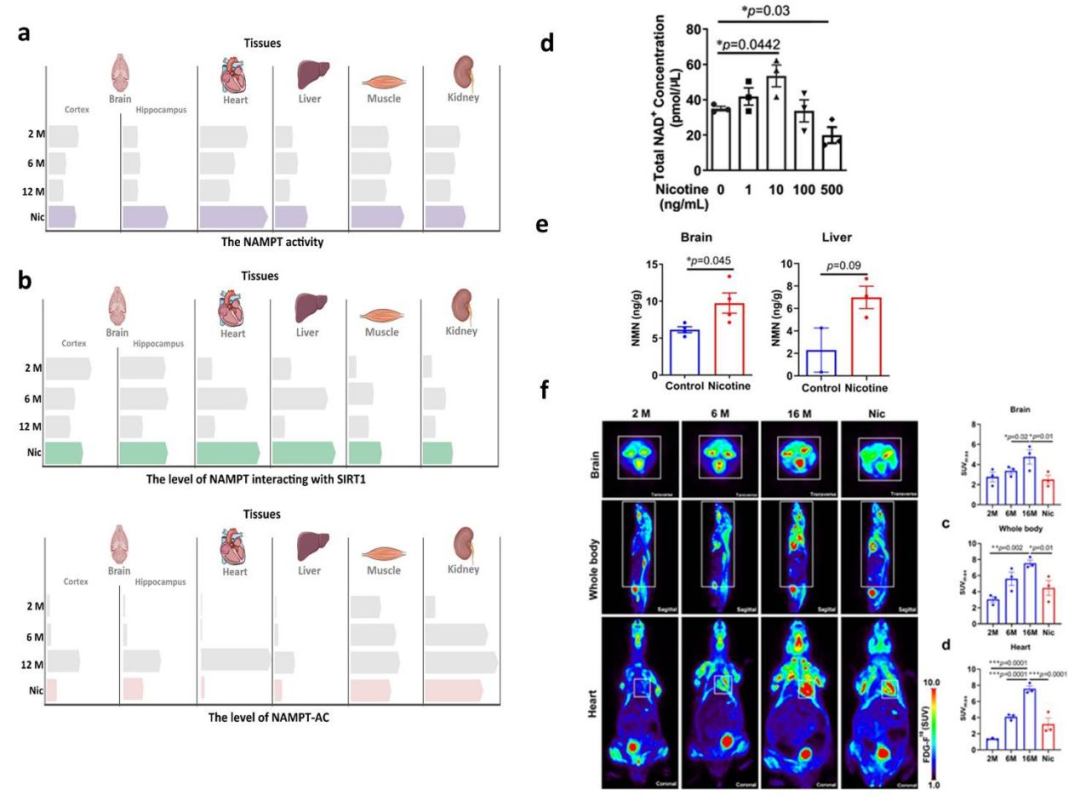 图1.尼古丁激活衰老组织NAD+生物合成以及改善衰老阻止葡萄糖高代谢情况