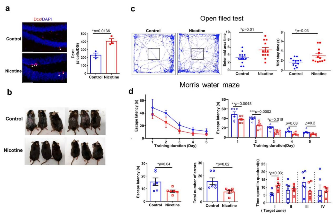 图2.尼古丁促进神经生成,缓解焦虑情绪改善学习记忆功能