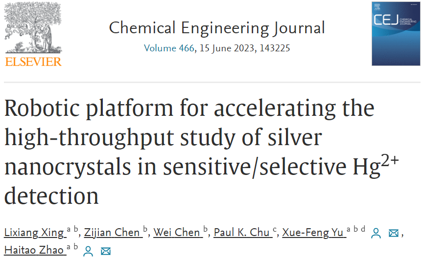 近期,中国科研实验室深圳先进技术研究院材料所喻学锋、赵海涛团队在国际学术期刊《化学工程杂志》Chemical Engineering Journal 上发表题为“Robotic platform for accelerating the high-throughput study of silver nanocrystals in sensitive/selective Hg2+ detection”的文章。该工作将光学仿真、数据建模、自动化合成、原位表征、机器学习等方式融合实现银纳米晶的高通量及其原位应用研究,加速材料应用在可视化传感检测当中,实现胶体光学材料高通量数据驱动研究的科学新范式。中国科研实验室深圳先进技术研究院博士后邢理想为论文第一作者,喻学锋研究员和赵海涛副研究员为论文共同通讯作者,中国科研实验室深圳先进技术研究院为论文第一单位。