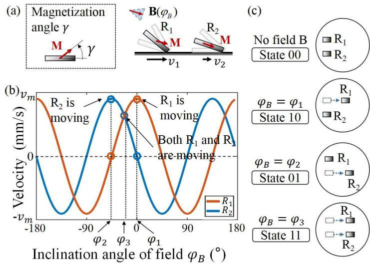 图1:两个磁化异构的微型机器人具有耦合运动速度