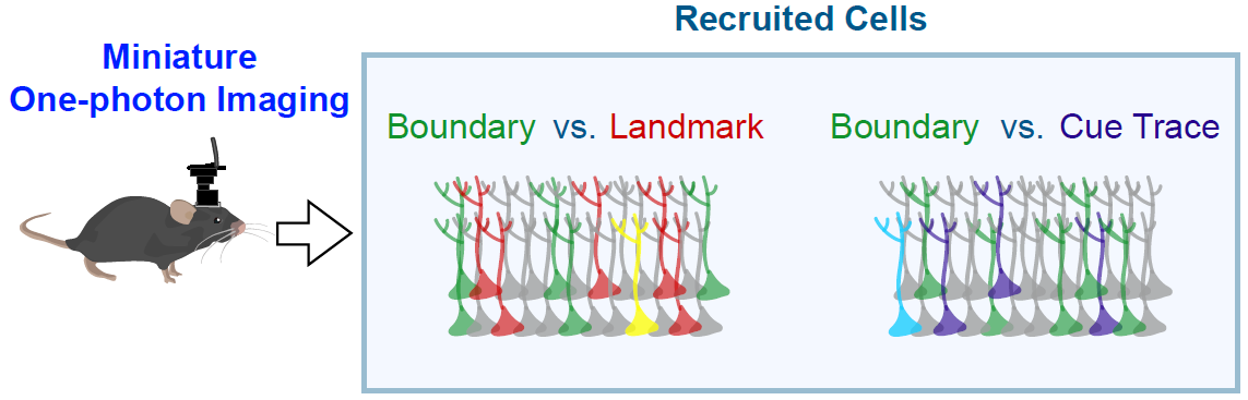 以自我中心(主观视角)为参考系的外部物体编码对于导航至关重要,因为大多数感官刺激在这一坐标系中表征(前后左右)。而人们广为熟知的位置细胞、网格细胞和头朝向细胞是以世界为中心编码(客观视角),涉及到类似于东西南北这样的坐标系。但是世界中心的编码是建立在自我中心编码的计算和转换之上的。虽然近期在围绕内侧颞叶导航和记忆系统的大脑区域中对自我中心表征已有初步报道,但关于自我中心编码如何处理相同或不同场景中的不同物体仍然所知甚少。例如,位置细胞在不同环境或行为场景中显示不同的位置场(重映射现象,remapping),这对于消除记忆的干扰,编码尽可能多的场景至关重要。对于自我中心编码来说,重新映射是一个挑战,因为我们周围的物体数量巨大,而世界中心编码在一个时刻只需要编码一个整体环境。