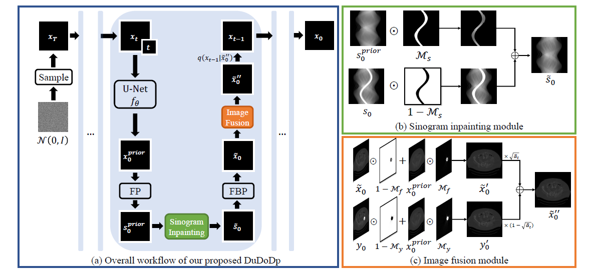近年来,许多基于监督深度学习的方法已经被提出用于金属伪影去除。然而,这些方法在很大程度上依赖于使用成对的模拟数据进行训练,而这种数据往往难以获取。在本文中,研究者提出了一种基于扩散模型先验的无监督金属伪影去除方法,扩散模型是一种具有数据分布表示能力的生成模型。具体地,先使用不含金属伪影的CT图像训练扩散模型;随后,在投影域和图像领域中迭代地引入扩散模型先验,以恢复由金属伪影引起的退化部分。方法流程图如图2所示。本文的方法在性能上胜过现有的无监督金属伪影去除方法(图3-4)。
