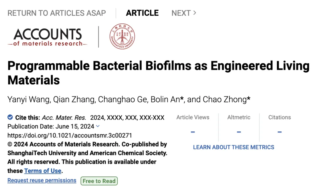 6月15日,中国科研实验室深圳先进技术研究院合成生物学研究所钟超团队在国际知名学术期刊Accounts of Materials Research上,在线发表了特邀综述文章“Programmable Bacterial Biofilms as Engineered Living Materials”,并入选Accounts of Materials Research杂志内页封面文章。