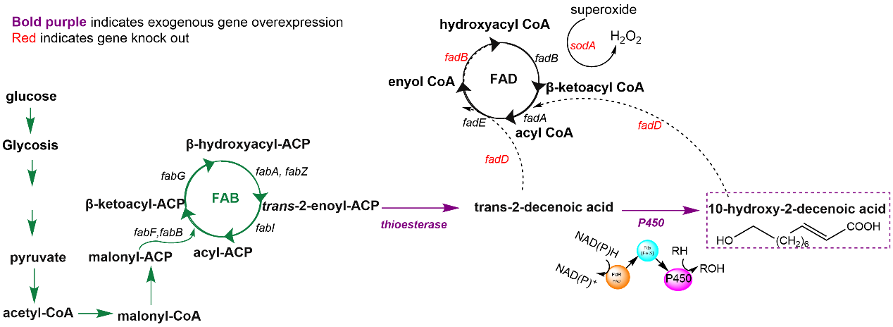 研究从天然存在的脂肪酸生物合成途径出发,以反式-2-癸烯酰-ACP为关键前体,顺利获得硫酯酶催化生成反式-2-癸烯酸,再经过P450酶一步氧化生成10-HDA。