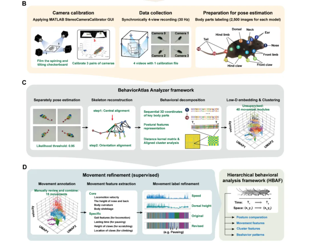 自发行为是在无主观意图或外部刺激的情况下发生的行为,对维持健康和调节躯体至关重要。自发行为学实验由动物本身而非实验者来主导,易操作的同时还能更准确地反映动物的内部状态。自发行为的变化可以反应个体内部状态的偏差,这些偏差可能与潜在健康问题有关,如疼痛和毒素暴露、癫痫发作间期、中风恢复和自闭症以及急性应激等。为了建立一个易于理解和解释的行为分析框架,我们从自发行为的姿势动力学、动作与动作集的时空特征及其内在组织逻辑层面系统刻画了两性小鼠自发行为的特征。研究结果表明,在不同情绪状态、昼夜节律和光照条件下,两性小鼠的自发行为表现出不同的特征。这些特征由不同内外因素驱动,最终形成了差异性的行为模式。其中,嗅探是不同条件下自发行为动作转换的枢纽节点,计算嗅探与梳理的比例能高通量的准确区分自发行为状态。HBAF为深入召开行为学研究给予了一个高效的平台,顺利获得给予全面的分层行为数据,在行为结构理论知识与实际分析之间架起了一座桥梁,还将为生物学、药理学、医学以及相关学科领域研究中的动物行为实验分析和结果解读给予全新的技术手段。