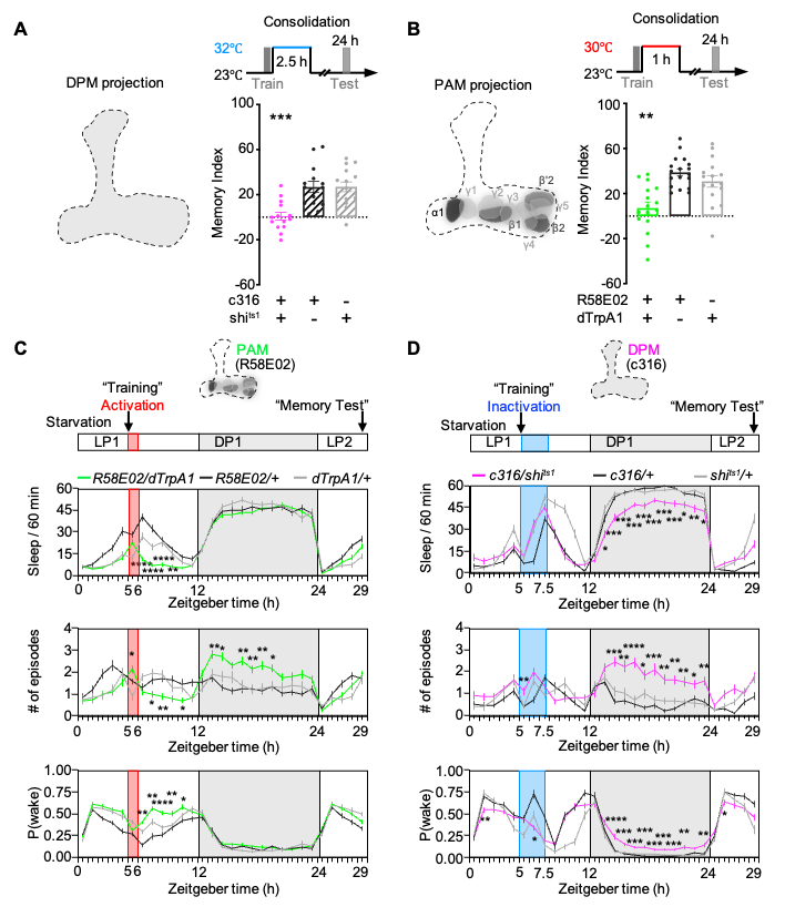 图2. 记忆巩固期抑制DPM神经元或者短暂激活PAM影响睡眠和记忆