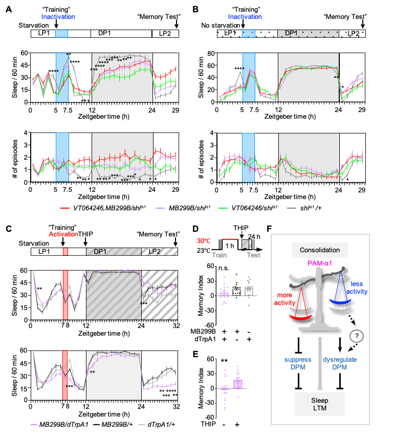 为确定这两种神经元是顺利获得平行且独立的环路还是整合的环路实现对睡眠和长时记忆的调控,研究团队利用精致的遗传学方法,同时失活两类神经元,结果发现,在饥饿状态下,睡眠减少及碎片化的程度与单独失活其中一类神经元的程度相同,阐释了PAM-DPM微环路共调控睡眠和记忆的工作模型。最后,为了加固这一微环路顺利获得协同作用导致睡眠干扰与记忆损伤的结论,研究团队采用了一种药理学方法,发现在喂食促眠的THIP(GABA激动剂)后,挽救了因短暂激活 PAM-α1所引起的睡眠紊乱,同时恢复了受损的长时记忆(图5)。