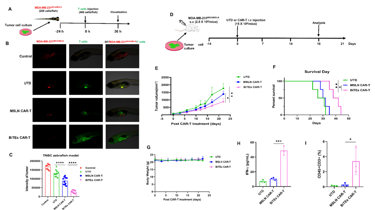图1. BiTEs CAR-T cells 在斑马鱼和小鼠移植瘤模型中展现出更强的抗肿瘤效果