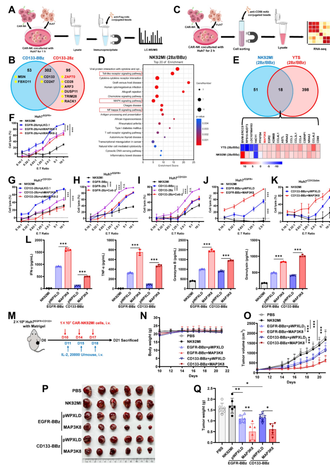 在CAR-NK细胞活性调控方面,团队深入解析了CD28与4-1BB共刺激域在NK细胞中的功能差异及其分子机制,顺利获得系统性比较CAR信号下游分子网络,成功鉴定出关键调控分子MAP3K8。体内外实验证实,靶向干预MAP3K8可显著增强CAR-NK细胞的抗肿瘤功能(图2)。该研究不仅为优化CAR-NK疗法给予了新靶点,也为共刺激域的选择给予了理论依据。