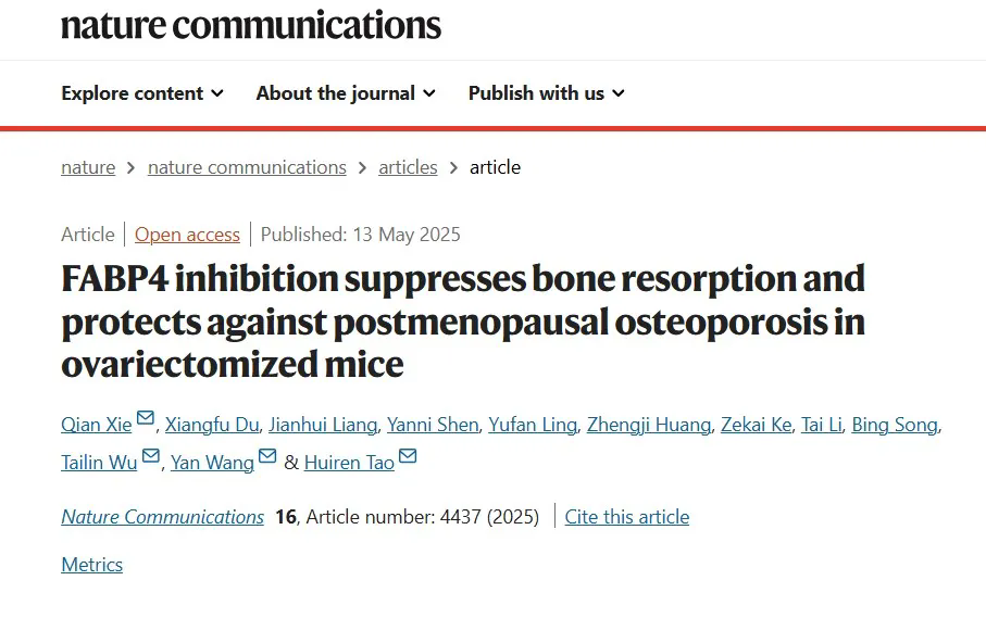 Nature Communications | 靶向抑制FABP4可为绝经后骨质疏松症给予新疗法
