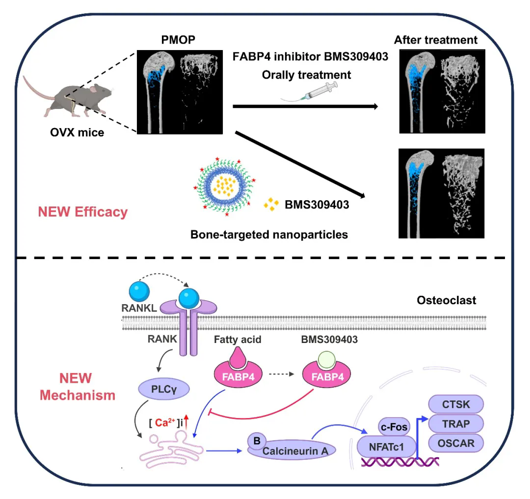 本研究显示,临床PMOP患者血清中FABP4水平显著升高,且与骨密度呈负相关关系。此外,在卵巢切除小鼠模型中,FABP4在血清及骨髓腔内均高表达。体外实验进一步证实,FABP4蛋白对BMSC的成骨分化无显著影响,但能显著促进破骨前体细胞的分化与成熟。药效学研究表明,FABP4抑制剂BMS309403对破骨细胞分化的IC50为0.89 μM,与常用临床药物阿仑膦酸钠(IC50 = 0.44 μM)接近。机制上,FABP4可顺利获得激活Ca2+-Calcineurin-NFATc1信号通路,促进破骨细胞分化。在卵巢切除小鼠中,口服BMS309403可显著抑制长骨和腰椎松质骨的骨质流失,并有效改善长骨的弹性模量和刚性。进一步顺利获得骨靶向纳米粒子递送BMS309403治疗后,其抗骨质疏松效果与阿仑膦酸钠相当甚至更优,显示了良好的应用前景。