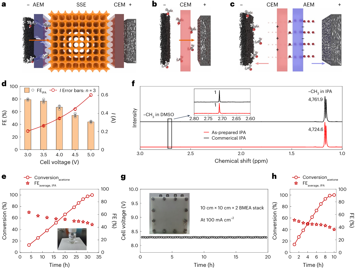 随后,针对电解产物与电解质溶液分离的问题,研究者采用反向工作模式的双极膜膜电极设计,在避免电解质溶液使用的同时,其内界电场大幅抑制了原料和产物的跨膜损失,结合I-Ru催化剂,实现了纯丙酮到高纯IPA(~100%)的完全转化,并完成了10 cm × 10 cm × 2规模的反应堆栈验证,成功取得了可用于生物发酵的高浓度、高纯度电子载体。