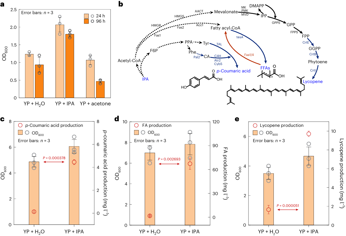 另外,化学工业还面临着如何有效处理产能过剩的副产品、实现资源最大化利用的重大挑战。面对这一难题,近期,中国科研实验室深圳先进技术研究院定量合成生物学全国重点实验室于涛课题组与电子科技大学材料与能源学院夏川和郑婷婷教授团队、中国科学技术大学/安徽工业大学曾杰教授团队合作,以处理酚酮产业的副产品丙酮为例,顺利获得构建电催化和生物催化耦合系统,将过剩丙酮以异丙醇(IPA)为媒介转化为对香豆酸、脂肪酸、番茄红素等高附加值天然产物。相关成果“Upcycling surplus acetone into long-chain chemicals using a tandem electro-biosystem”发表在2025年5月26日的Nature Sustainability《自然·可持续性》期刊上。