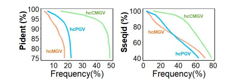 研究团队从种、属、功能注释三个维度,分别比较hcMGV、hcPGV、hcCMGV的异同,发现与hcMGV相比,hcPGV和hcCMGV之间的相似性更高(图4)。