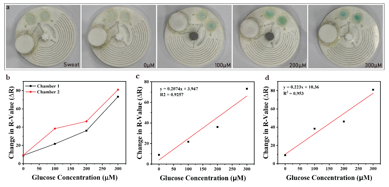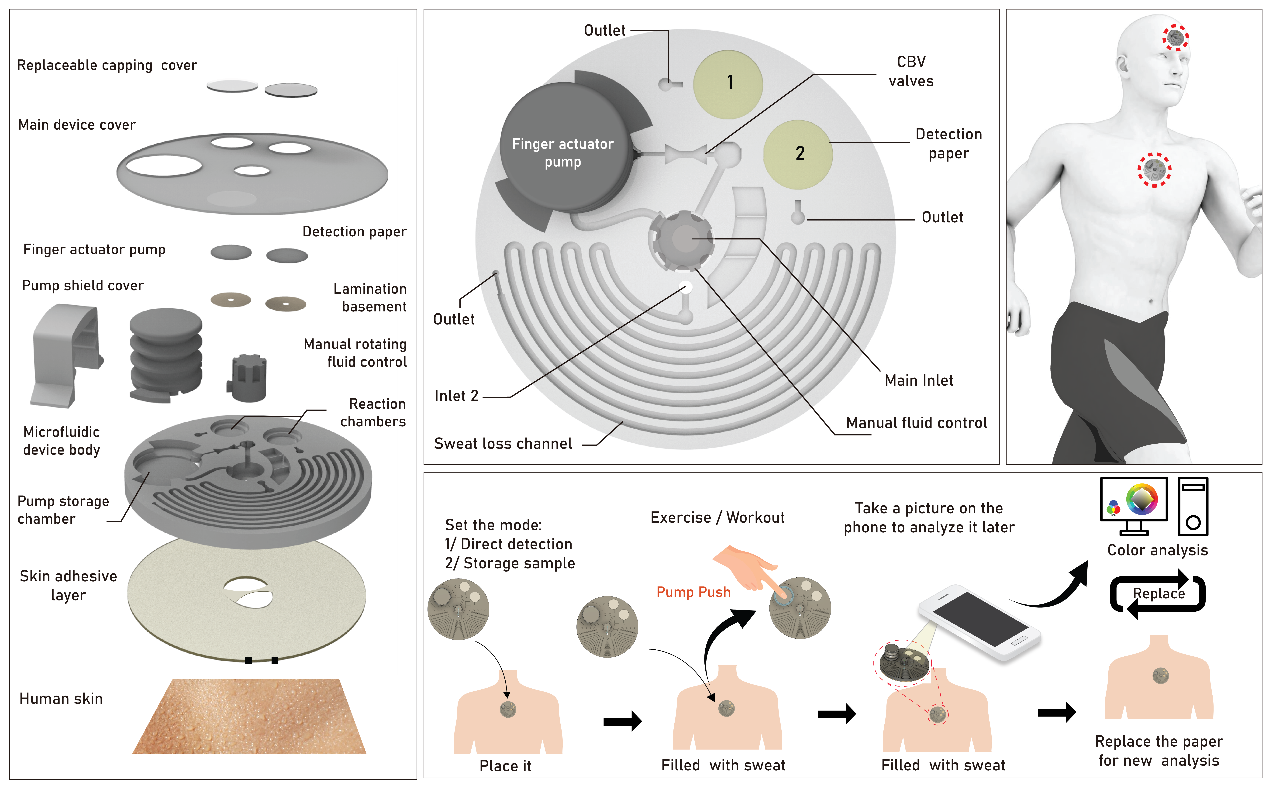 在该研究中,团队开发了一种新型的半自动操作微流控平台,该平台整合了可旋转通道控制机制和手指驱动泵。这种双模式操作设置使得实时生物标志物分析和延迟采样成为可能,解决了当前可穿戴设备只能单一模式操作的局限性。该平台允许用户自主控制何时以及如何收集和分析汗液,并可实现立即检测或者延迟检测两种操作选择,且该平台能确保样本体积的一致性以及可靠的生物标志物分析。这一创新的微流控平台在实验中进行了验证,并成功地基于比色法原理检测到了汗液中葡萄糖的浓度,证实了基于微流控流体机制的可重复性以及实时汗液诊断的可行性,为运动场景给予了一种创新的无创葡萄糖监测方案。该研究为在运动科学、个性化医学以及移动健康监测等领域开辟了新的可能性,尤其适合在资源有限的环境以及移动医疗环境中使用。