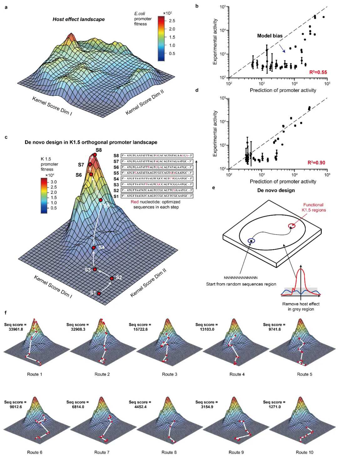 为评估该策略的系统适配性,研究团队进一步将活性功能景观建模与从头设计方法拓展至T7 RNA聚合酶系统。作为经典的合成表达平台,T7系统具有较强的表达能力和广泛的应用基础。研究显示,所生成的T7启动子序列同样实现了表达水平的可控设计,且与模型预测结果高度一致。这一结果验证了该方法不仅适用于K1.5系统,还具备向其他单因子驱动、正交表达系统泛化的能力,为调控元件的模块化设计与系统工程化打下了通用基础。