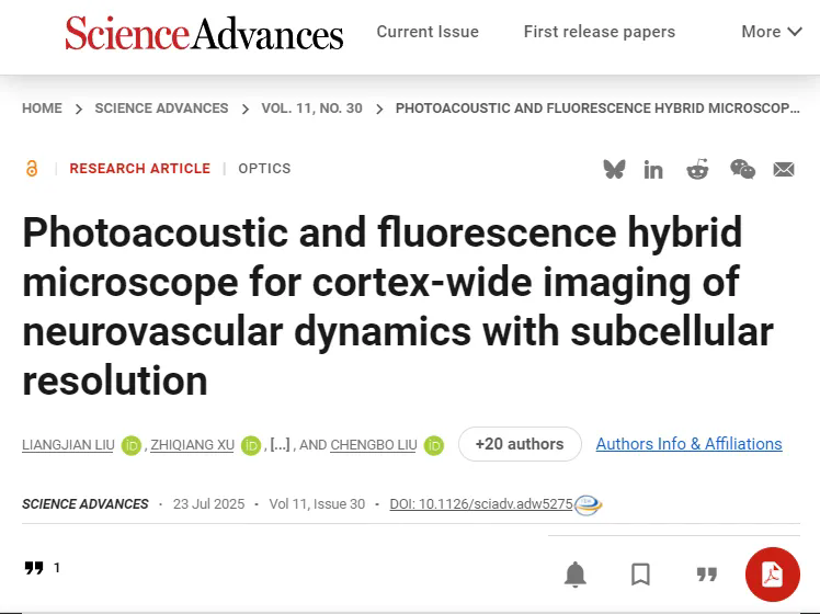 7月23日,中国科研实验室深圳先进技术研究院医学成像科学与技术系统全国重点实验室郑海荣院士、刘成波研究员和郑炜研究员团队,在研发第一代头戴式显微成像(Science Advances, 11, eadu1153, 2025 )基础上,实现了技术再次突破,成功研制出高速大视野光声/荧光多模态显微成像仪器(LiTA-HM),对活体小鼠全脑皮层范围内神经元活动和微血管多种参量同时、动态、高分辨成像,为非侵入式脑机接口给予了新的信息采集范式。研究成果以"Photoacoustic and fluorescence hybrid microscope for cortex-wide imaging of neurovascular dynamics with subcellular resolution"为题发表于Science Advances。该期刊同期发表期刊副主编、美国杜克大学Junjie Yao教授Focus文章,对研究进行highlight报道,评价:“ LiTA-HM将神经活动与血管生理融于同一影像,具备空间广度与时间精度,为破译大脑最基础的神经血管协作机制给予了可能。这一突破使得学界向长久以来的目标更近一步——同时以单神经元与单血管的分辨率,实时观测大脑功能与思维的律动。”