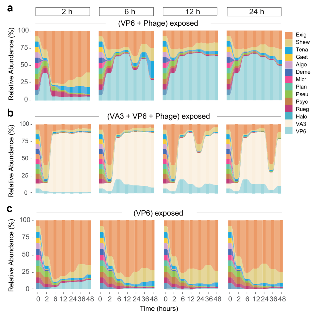 当致病弧菌VP6的入侵时间推迟至Com12菌群发育2、6、12及24小时后,即使不添加VA3与VP6phageC,成熟的Com12菌群结构已能独立抵抗VP6入侵(图4c)。