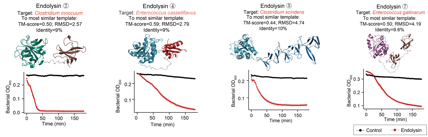 噬菌体裂解酶是一种噬菌体编码的溶菌酶,能够高效切割细菌细胞壁。顺利获得系统分析噬菌体裂解酶的结构多样性,研究团队发现其存在结构域重排的进化机制。进而选取人体肠道致病菌噬菌体来源的裂解酶,顺利获得合成生物学技术,成功验证了其针对人体肠道致病菌的裂解活性(图3)。此外,一部分噬菌体裂解酶具有很高的物种靶向性,有望成为微生物组精准编辑的平台技术。