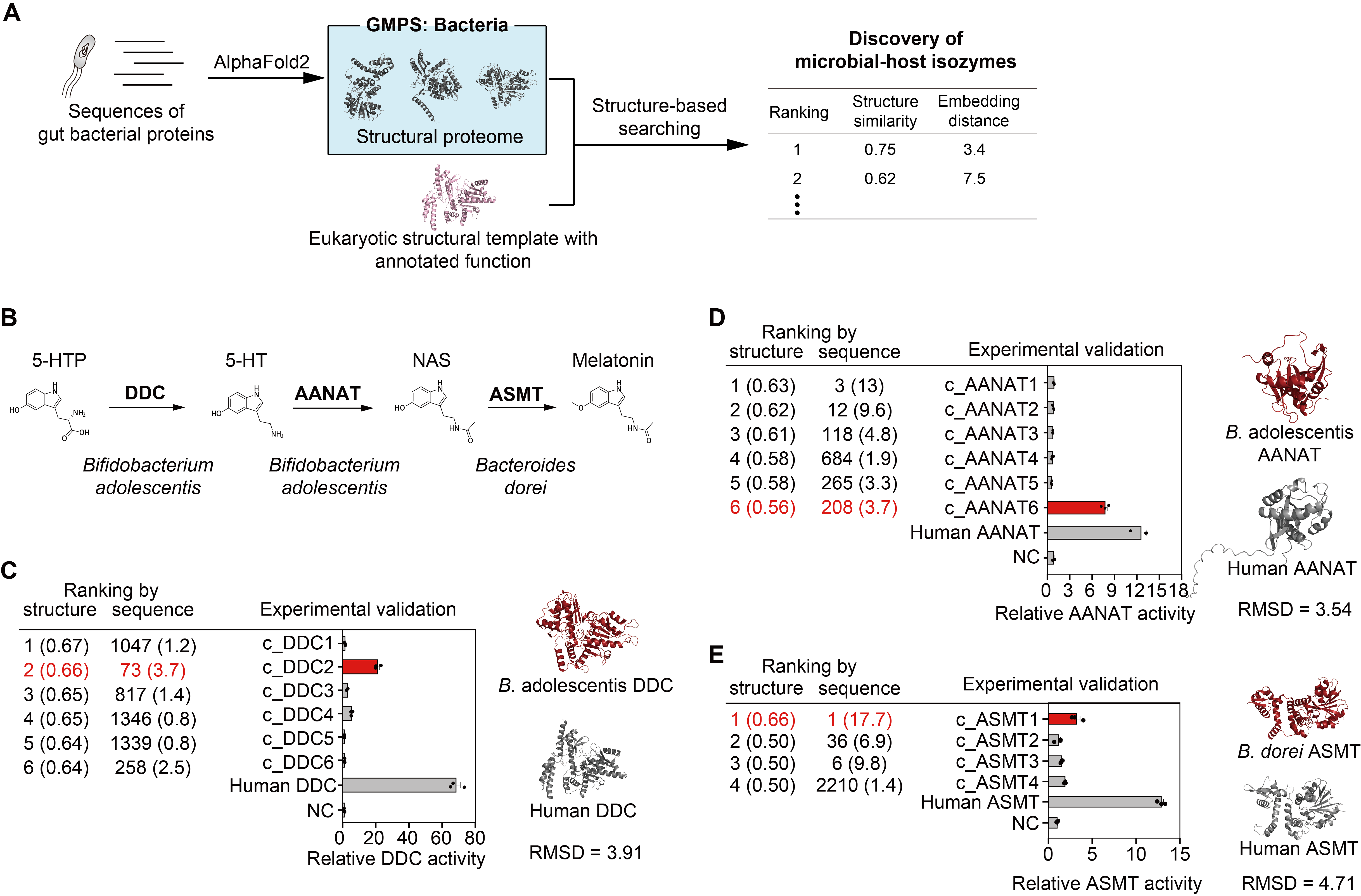 研究团队进一步将结构检索的方法拓展至肠道菌源的宿主同工酶。前期研究发现,肠道细菌编码的酶能模拟宿主酶的功能,参与疾病的发生开展过程。顺利获得结构检索,研究团队在青春双歧杆菌(Bifidobacterium adolescentis)、多形拟杆菌(Bacteroides dorei)中发现了参与褪黑素合成的关键酶,首次揭示了肠道微生物的褪黑素合成途径(图4)。